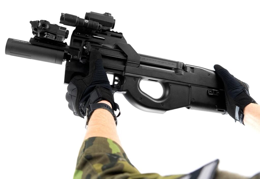 La nostra piattaforma P90 è progettata per essere personalizzabile. Il supporto superiore è dotato di una guida Picatinny standard sulla parte superiore per il mirino, oltre che di slot attacchi entrambi i lati per ulteriori accessori. Una volta rimosso il supporto superiore, è disponibile una guida aftermarket opzionale per il mirino a punto rosso compatto. Inoltre, la replica una filettatura da 14 mm in senso antiorario silenziatore. Se desideri aggiungere altri accessori, puoi sempre utilizzare la nostra estensione per slot anteriore. Ciò ti consentirà di montare una scatola PEQ ribassata o una telecamera con zoom sull'SSR90.